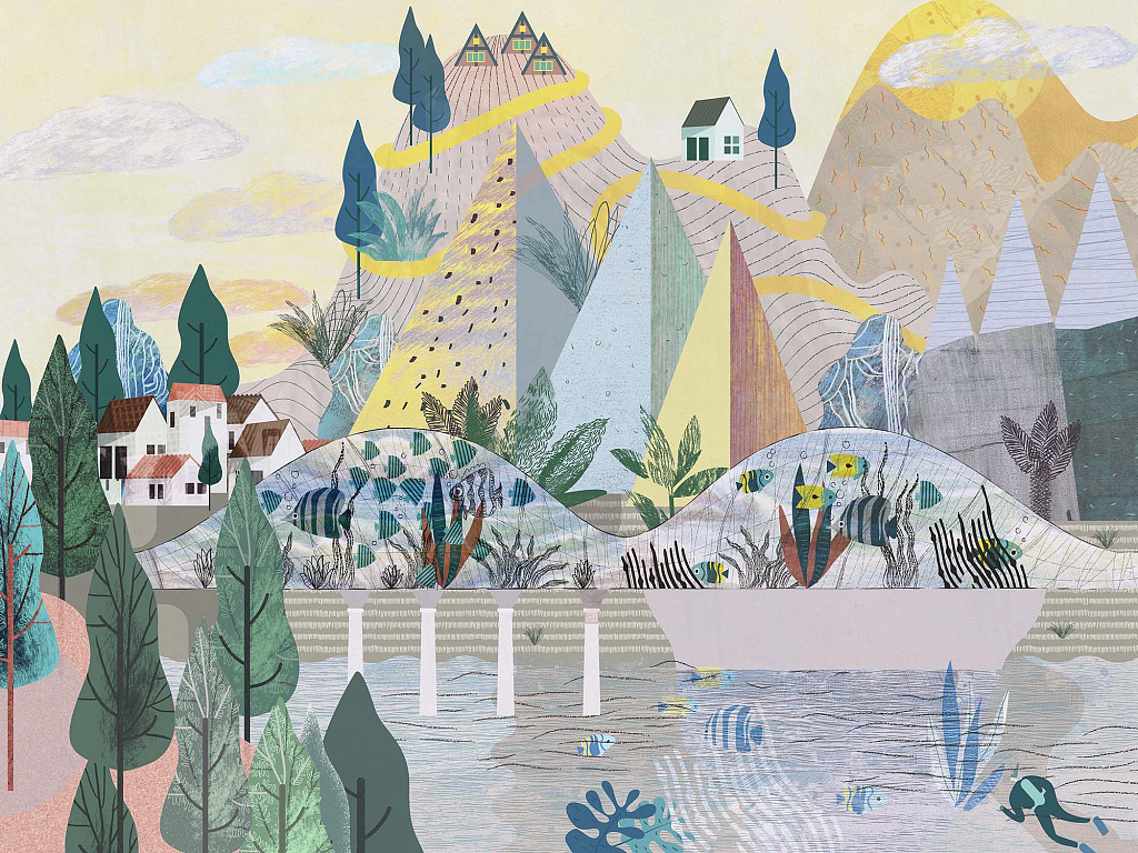 - Рисунок: Живопись, Горы, Город, Деревья, Река